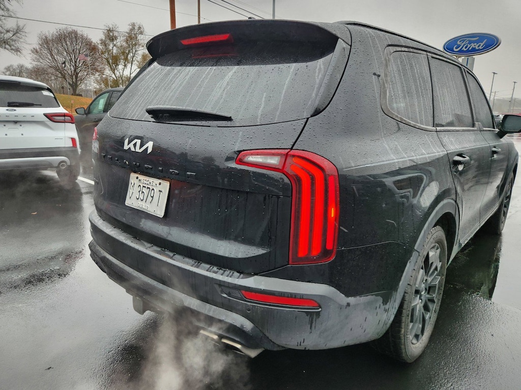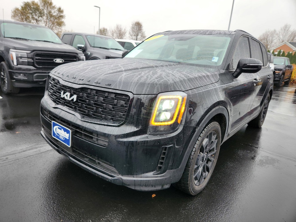 Telluride EX 20" x 7.5" Machined Alloy Wheels, 2nd Row Captain Chairs, 3.648 Axle Ratio, 3rd row seats: split-bench, 4-Wheel Disc Brakes, 6 Speakers, ABS brakes, Air Conditioning, AM/FM radio: SiriusXM, Apple CarPlay & Android Auto, Auto-dimming Rear-View mirror, Automatic temperature control, Black Finish Radiator Grille, Brake assist, Bumpers: body-color, Carpeted Floor Mats, Compass, Delay-off headlights, Driver door bin, Driver vanity mirror, Dual front impact airbags, Dual front side impact airbags, Electronic Stability Control, Emergency communication system: 911 Connect, EX Premium Package, Exclusive Black Headlight Bezels, Four wheel independent suspension, Front & Rear Gloss Black Finish Bumper Skid Plates, Front anti-roll bar, Front Bucket Seats, Front Center Armrest, Front dual zone A/C, Front reading lights, Fully automatic headlights, Gloss Black Finish Exterior Emblems, Gloss Black Finish Front & Rear Door Garnish, Gloss Black Finish Roof Rails, Heated & Ventilated Front Bucket Seats, Heated door mirrors, Heated front seats, Heated steering wheel, Illuminated entry, Knee airbag, Leather Seat Trim, Leather Shift Knob, Leather steering wheel, LED Headlamps, Low tire pressure warning, Navigation System, Nightfall Edition Package, Occupant sensing airbag, Outside temperature display, Overhead airbag, Overhead console, Panic alarm, Passenger door bin, Passenger vanity mirror, Power door mirrors, Power driver seat, Power Liftgate, Power moonroof, Power passenger seat, Power steering, Power windows, Radio data system, Radio: AM/FM Display Audio System, Rear air conditioning, Rear anti-roll bar, Rear audio controls, Rear reading lights, Rear seat center armrest, Rear window defroster, Rear window wiper, Reclining 3rd row seat, Remote keyless entry, Roof rack: rails only, Satin Chrome Roof Rails, Security system, Self Leveling Rear Suspension, Smart Key w/ Push Button and Remote Start, Speed control, Speed-sensing steering, Split folding rear seat, Spoiler, Steering wheel mounted audio controls, Tachometer, Telescoping steering wheel, Tilt steering wheel, Tow Hitch w/Harness (TOF), Towing Package, Traction control, Trip computer, Turn signal indicator mirrors, Variably intermittent wipers, Ventilated front seats, Wheels: 20" x 7.5" Exclusive Black Alloy. CARFAX One-Owner. Clean CARFAX.